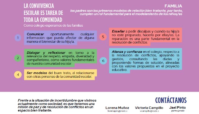 Durante los encuentros se realizaron dos talleres de trabajo grupal en base al Reglamento de Convivencia Escolar NSDC. En el primero, tuvieron que pensar como familia, en su rol formativo, cuáles pueden ser las acciones de reparación en caso de que algún estudiante tenga una dificultad con otro/a (ejemplo: hijo/a molesta a un compañero/a).