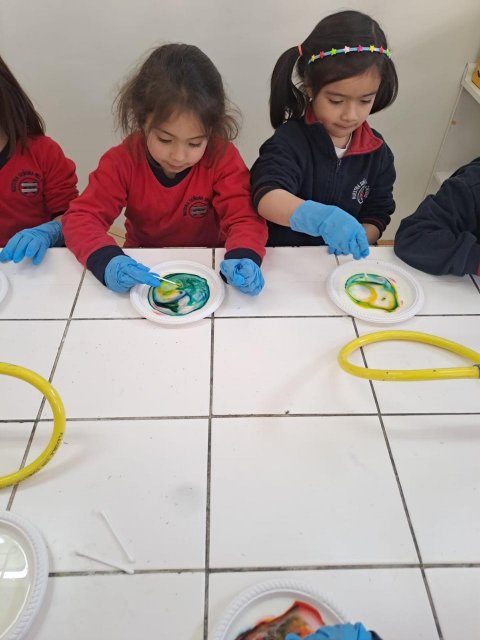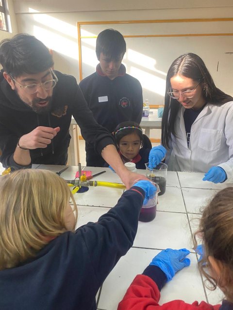 Durante la actividad, los estudiantes mayores prepararon estaciones experimentales especialmente pensadas para las y los más pequeños, con el objetivo de acercarlos al pensamiento científico desde una edad temprana. Cada estación fue liderada por un alumno o alumna de IV Medio, quien presentó un experimento simple, utilizando materiales seguros y estrategias lúdicas que promovieron la curiosidad, la observación y el diálogo.