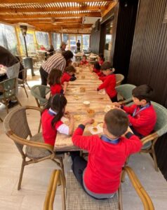 Durante la visita recorrieron la cocinería, la cafetería y el sector de juegos, además de participar en la elaboración de pan amasado y dulces chilenos. Esta experiencia les permitió acercarse al oficio de los papás y mamás de su curso, valorando el trabajo y dedicación que hay detrás de la repostería.